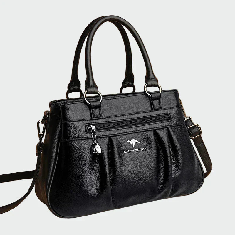 Елегантна черна дамска чанта за ръка и рамо, изработена от висококачествен синтетичен кожен материал с лека текстура. Разполага с две стабилни дръжки за комфортно държане и свалящ се раменен ремък за по-голяма гъвкавост при носене. Външният цип на предната част придава на чантата функционалност и стил, докато металният ключодържател подчертава нейния луксозен вид. Идеален избор за офиса и ежедневна употреба.