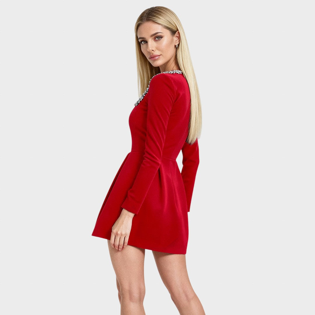 Роклята съчетава вечна силует с женствена изтънченост. Прилепналият кройка и благородният материал подчертават всяко движение елегантно, докато дискретните детайли на деколтето придават очарователни акценти. Перфектна за вечери, събития или специални поводи, където стилът е важен.