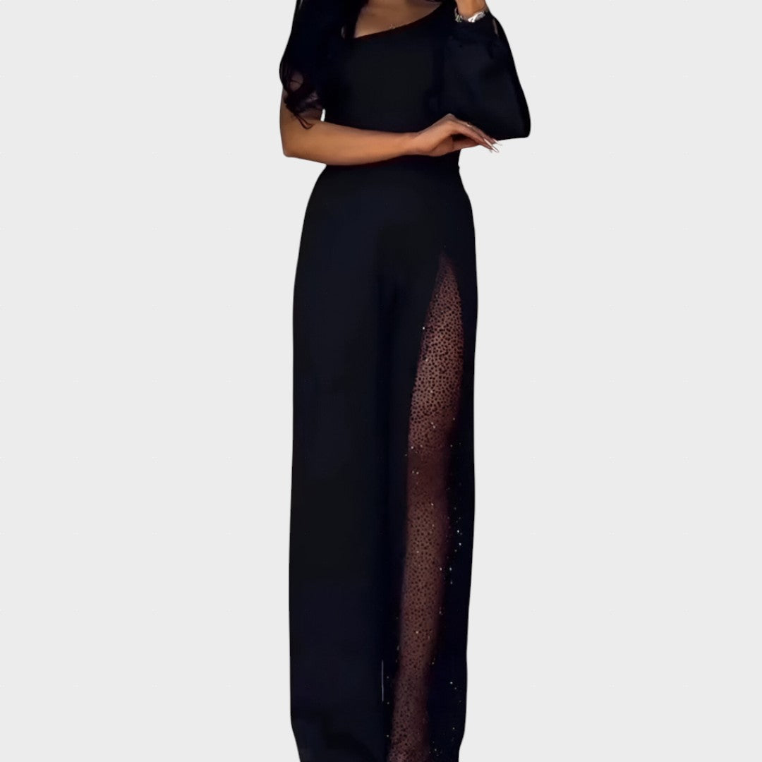 Уникален дизайн: Асиметричната горна част и деликатните прозрачни детайли на краката правят този гащеризон истинска забележителност.