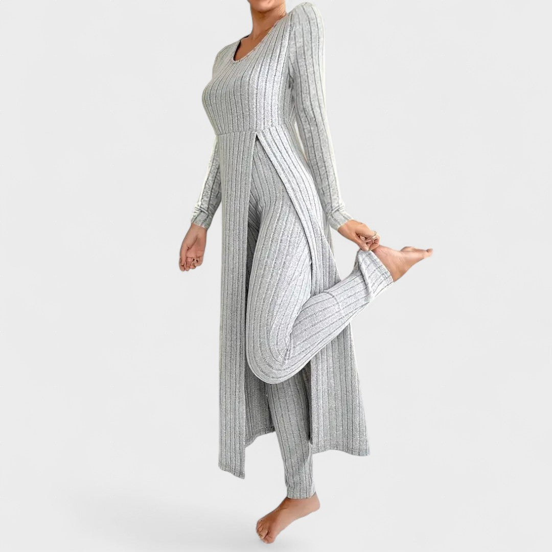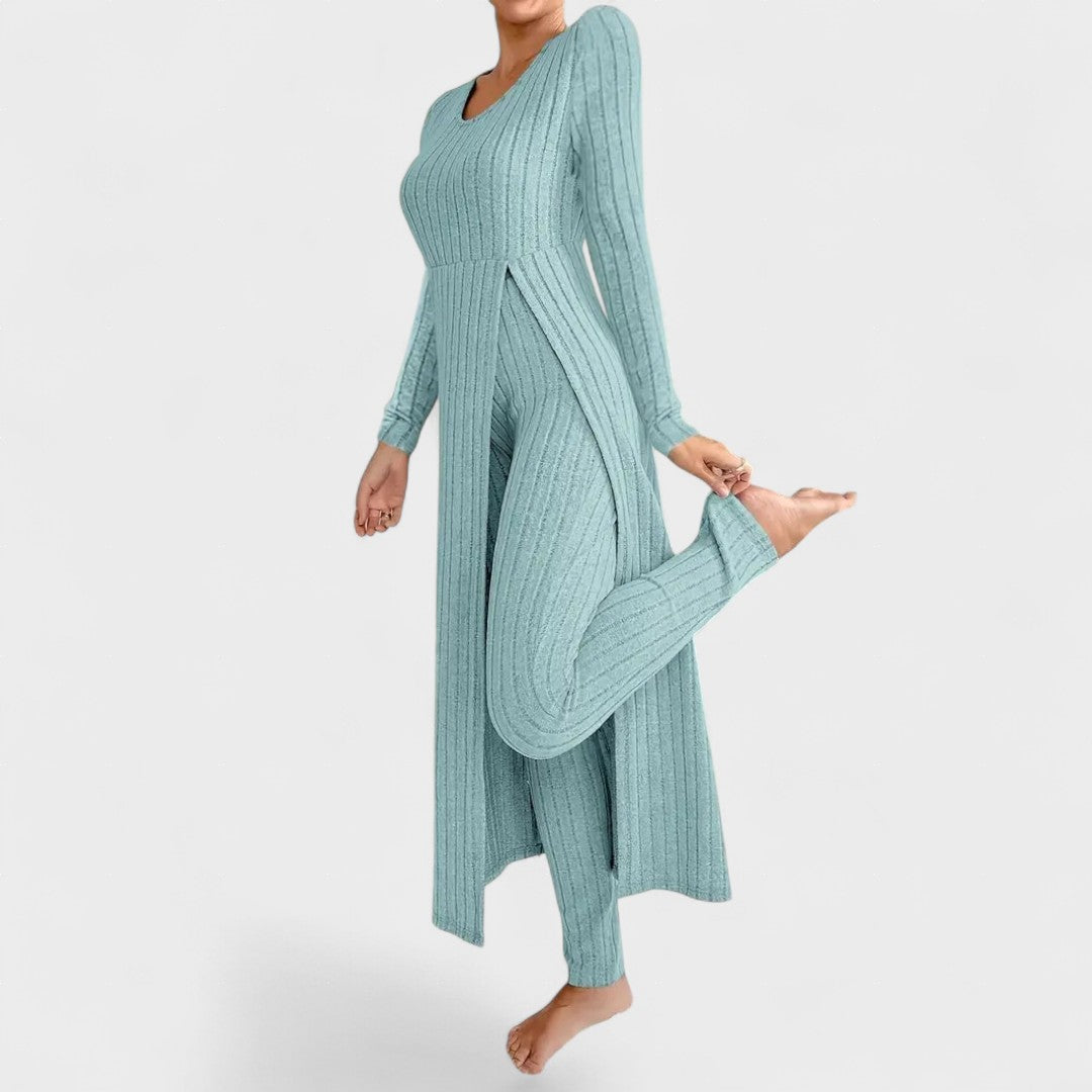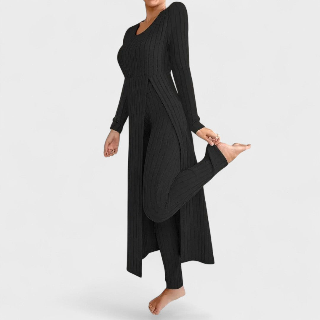 Този комплект от две части съчетава женствена елегантност с ненадминат комфорт при носене. Фините рипсени материи нежно обгръщат тялото и естествено подчертават силуета. Със своя плавен крой и приятна еластичност, той е идеален за релаксиращи часове у дома или стилни свободни визии.