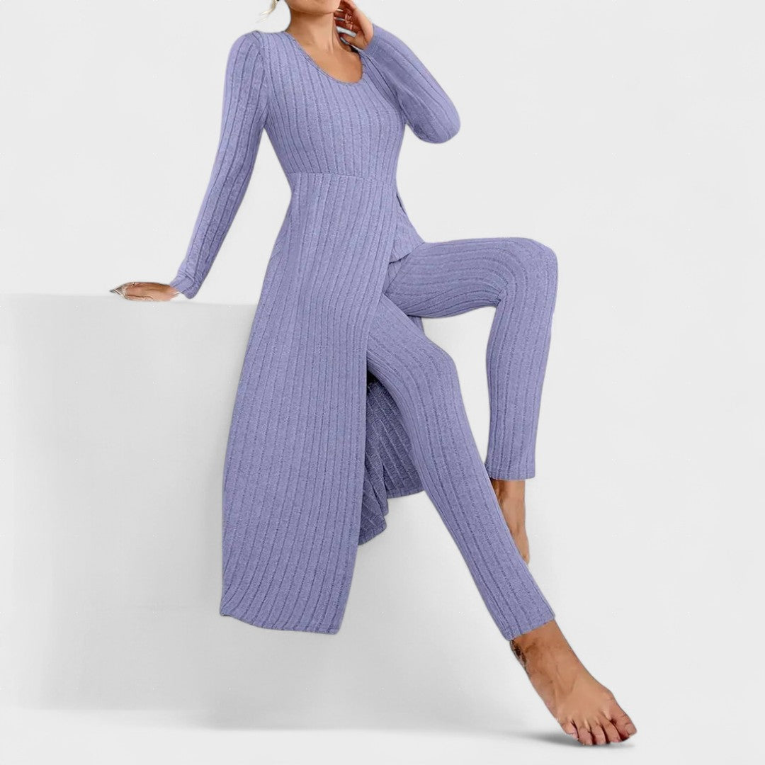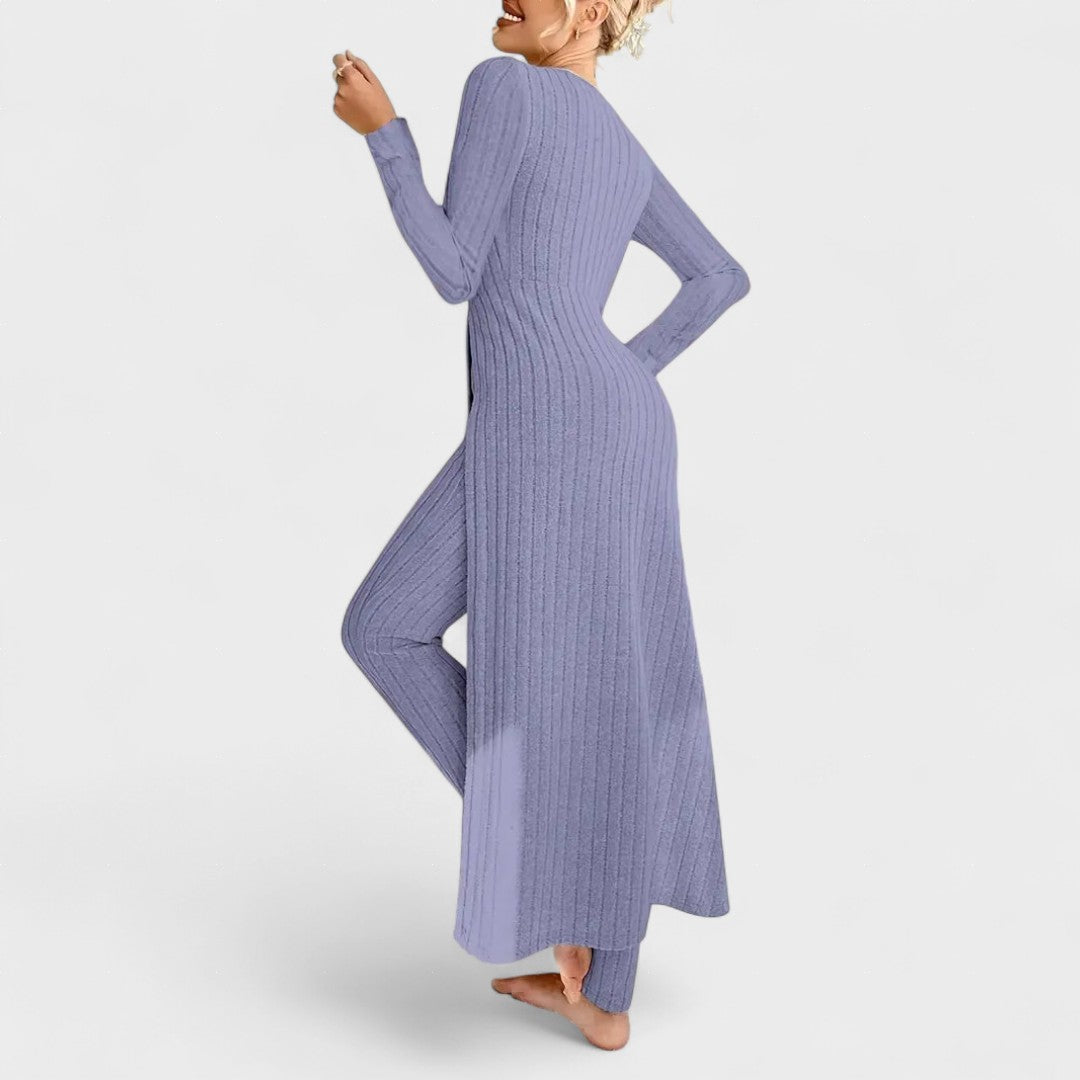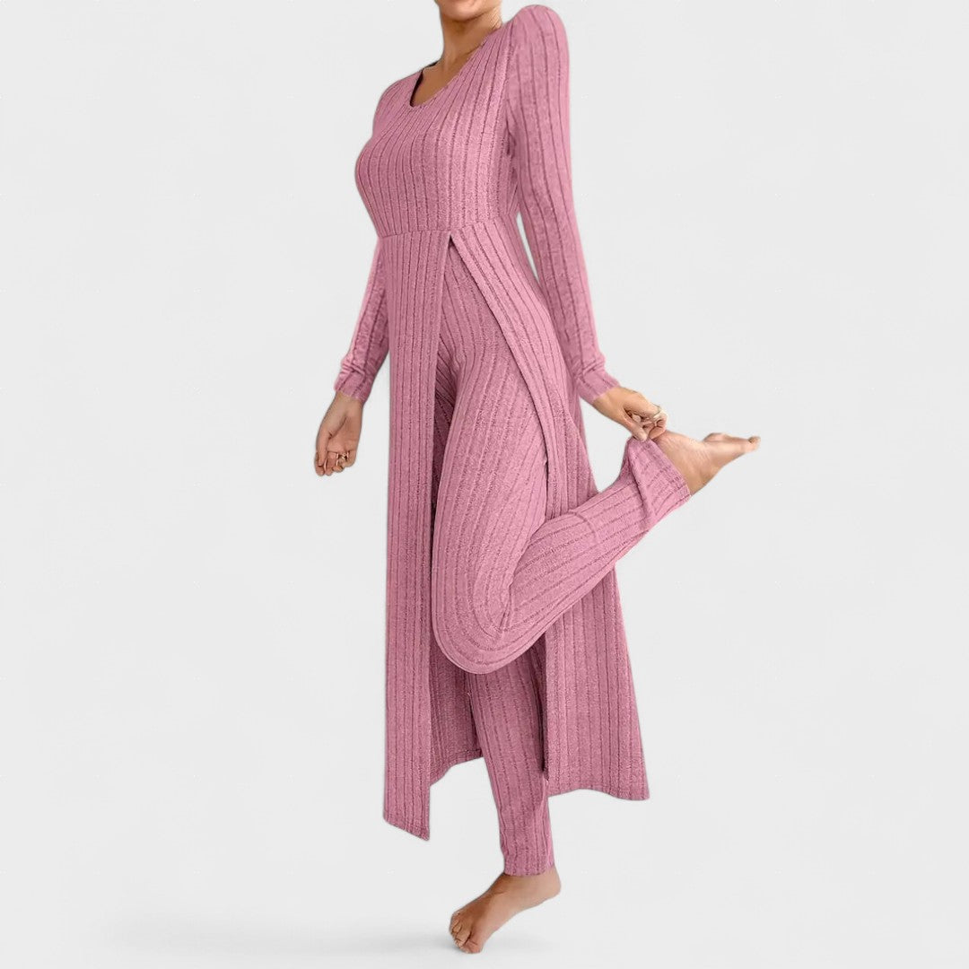 Този комплект от две части съчетава женствена елегантност с ненадминат комфорт при носене. Фините рипсени материи нежно обгръщат тялото и естествено подчертават силуета. Със своя плавен крой и приятна еластичност, той е идеален за релаксиращи часове у дома или стилни свободни визии.