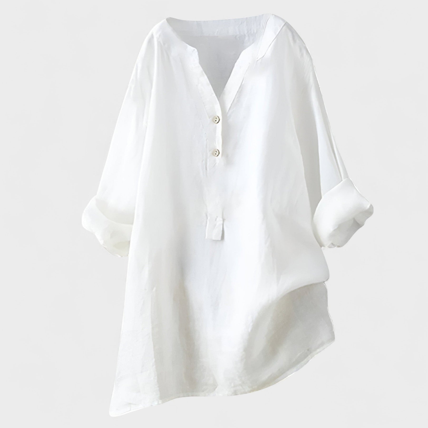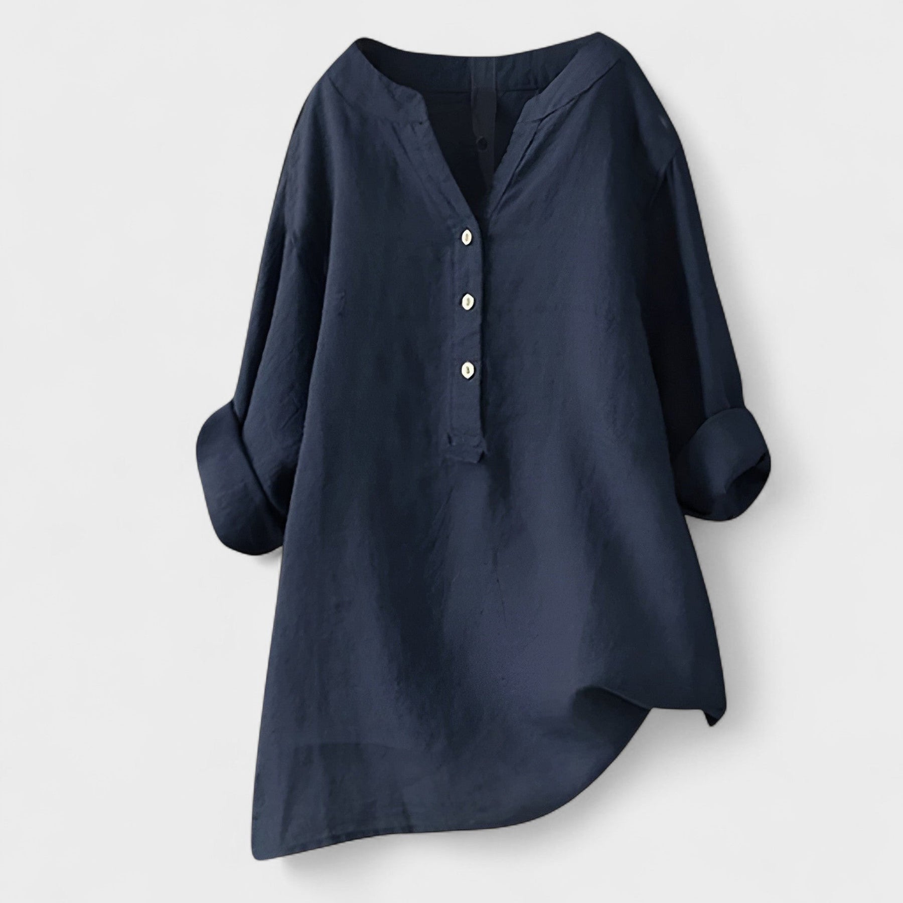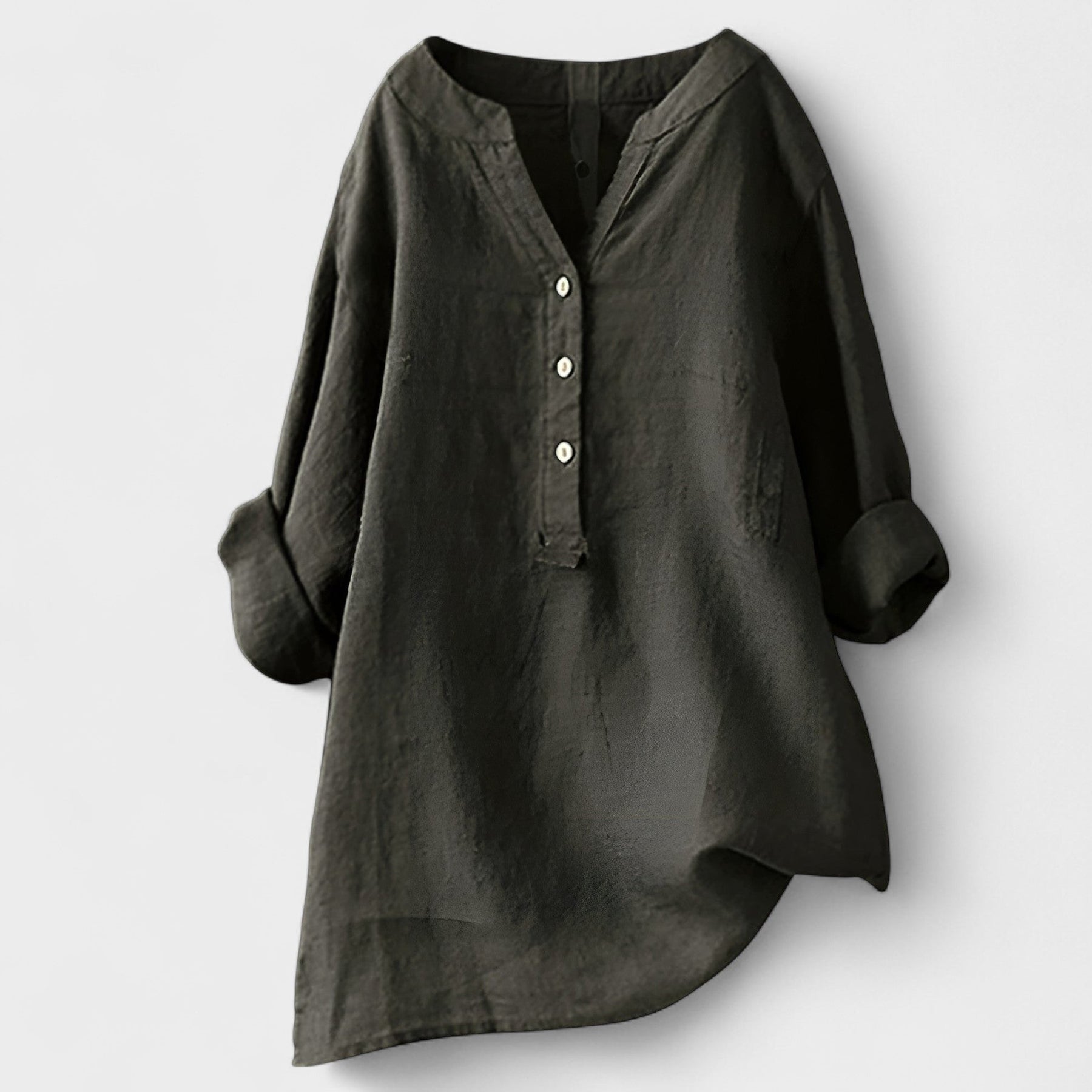 Благодарение на свободния крой и леките материали, тази риза е идеална за тези, които ценят както комфорта, така и стила в ежедневния си гардероб. V-образното деколте с копчета отпред придава нотка на елегантност, докато дългите ръкави, които могат да се навиват, правят ризата подходяща за носене през цялата година. Истинско основно парче за гардероба, което съчетава небрежност с изисканост.