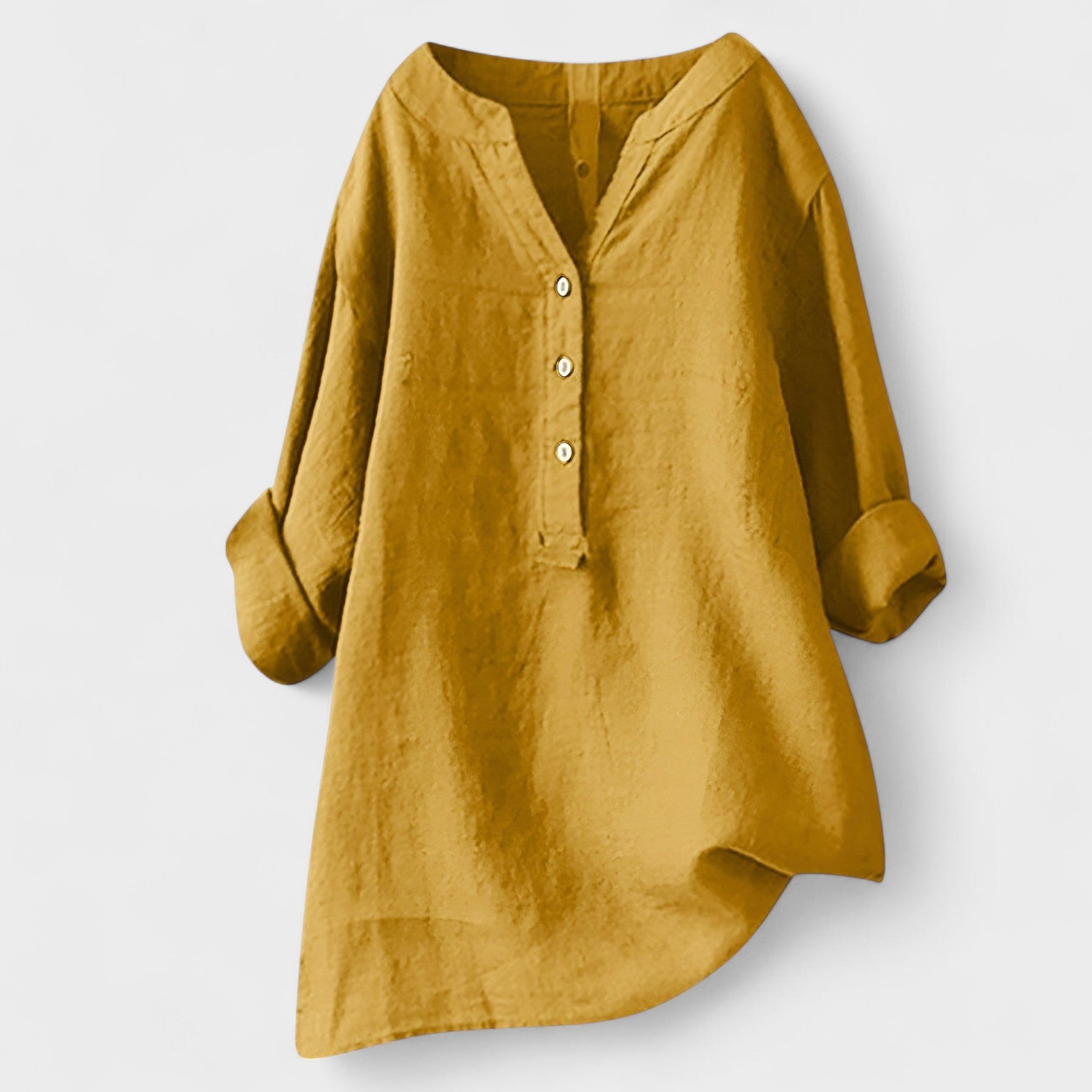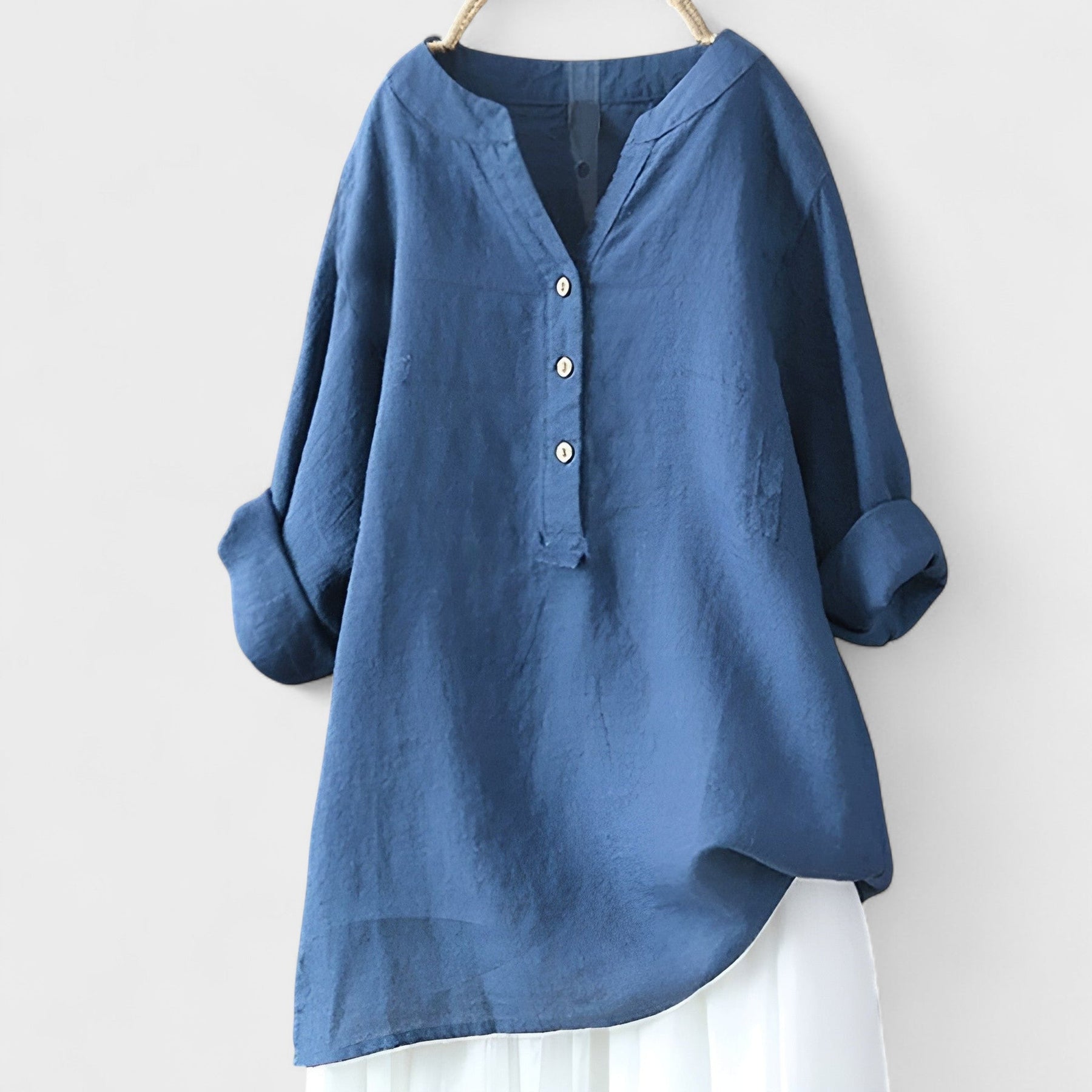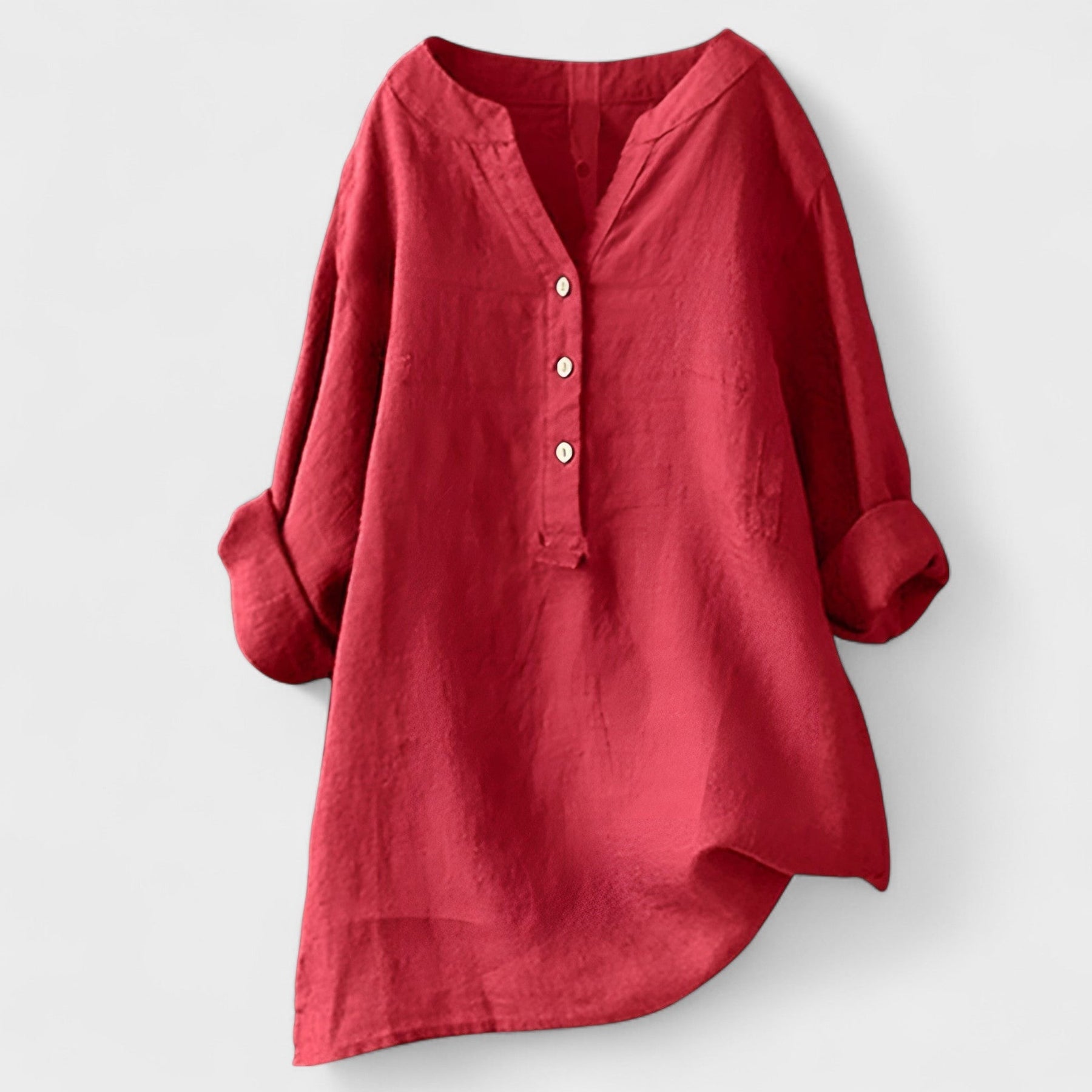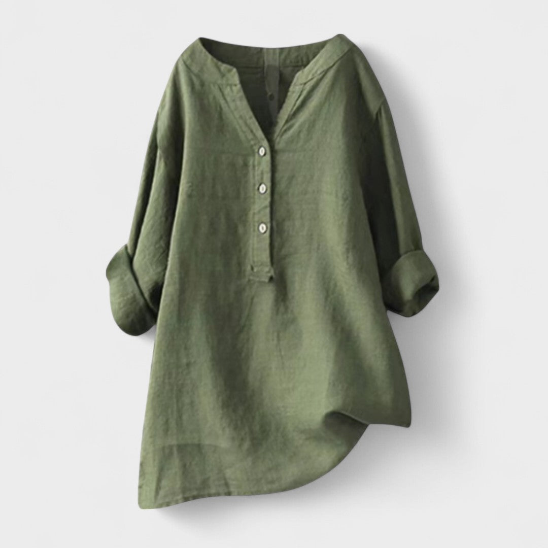 Благодарение на свободния крой и леките материали, тази риза е идеална за тези, които ценят както комфорта, така и стила в ежедневния си гардероб. V-образното деколте с копчета отпред придава нотка на елегантност, докато дългите ръкави, които могат да се навиват, правят ризата подходяща за носене през цялата година. Истинско основно парче за гардероба, което съчетава небрежност с изисканост.