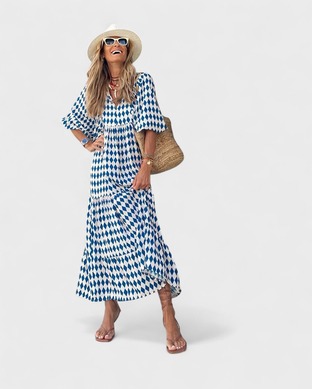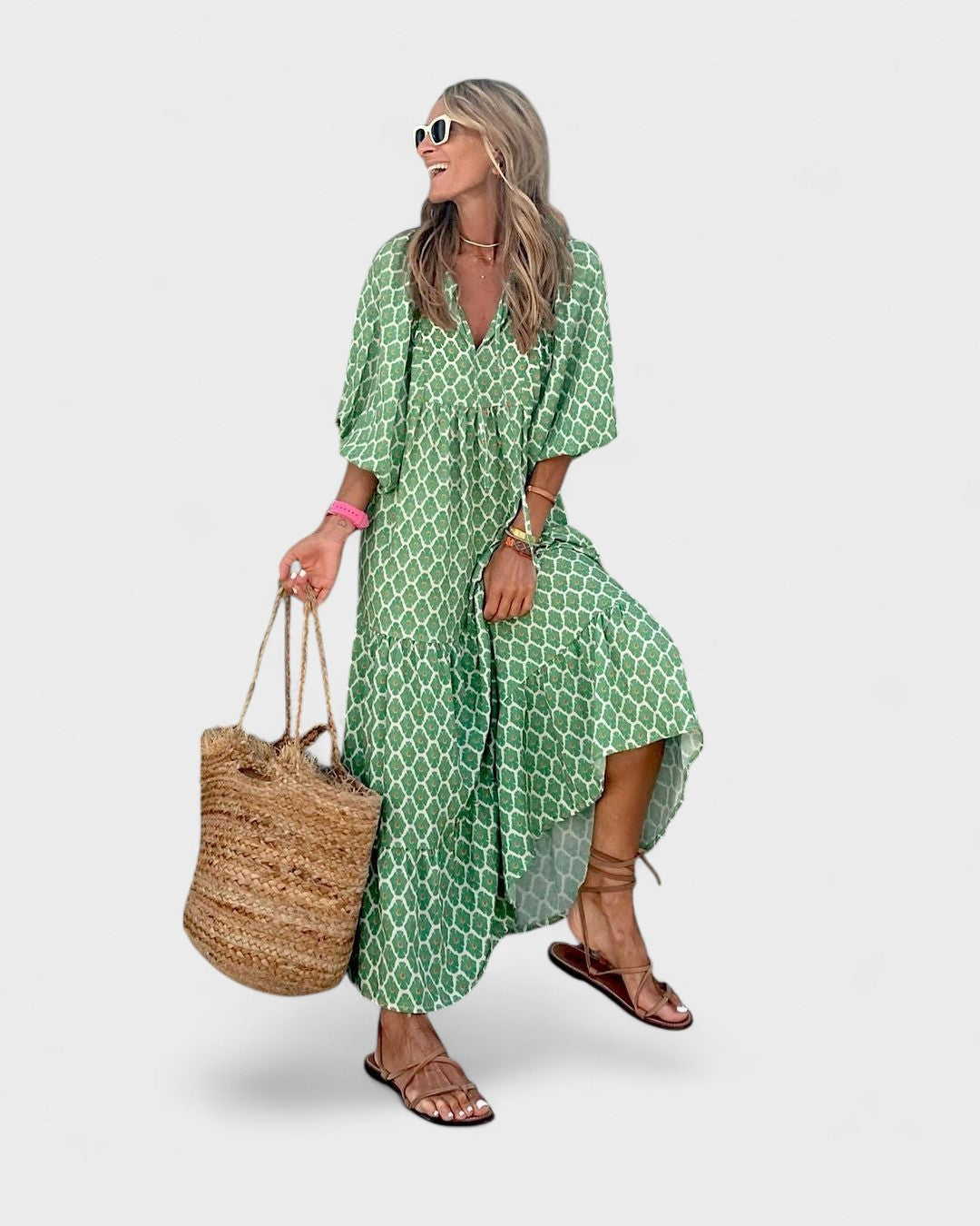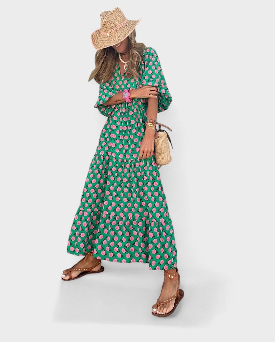 Тази дълга рокля с бохемски вдъхновен дизайн е идеалният избор за слънчеви и релаксиращи дни с нотка на елегантност. Забележителният флорален принт и свободният кройка осигуряват свобода на движение, комфорт и впечатляващ външен вид. Ръкави с дължина 3/4 и леко повдигната талия правят роклята универсална и ласкава за всякакви форми на тялото.