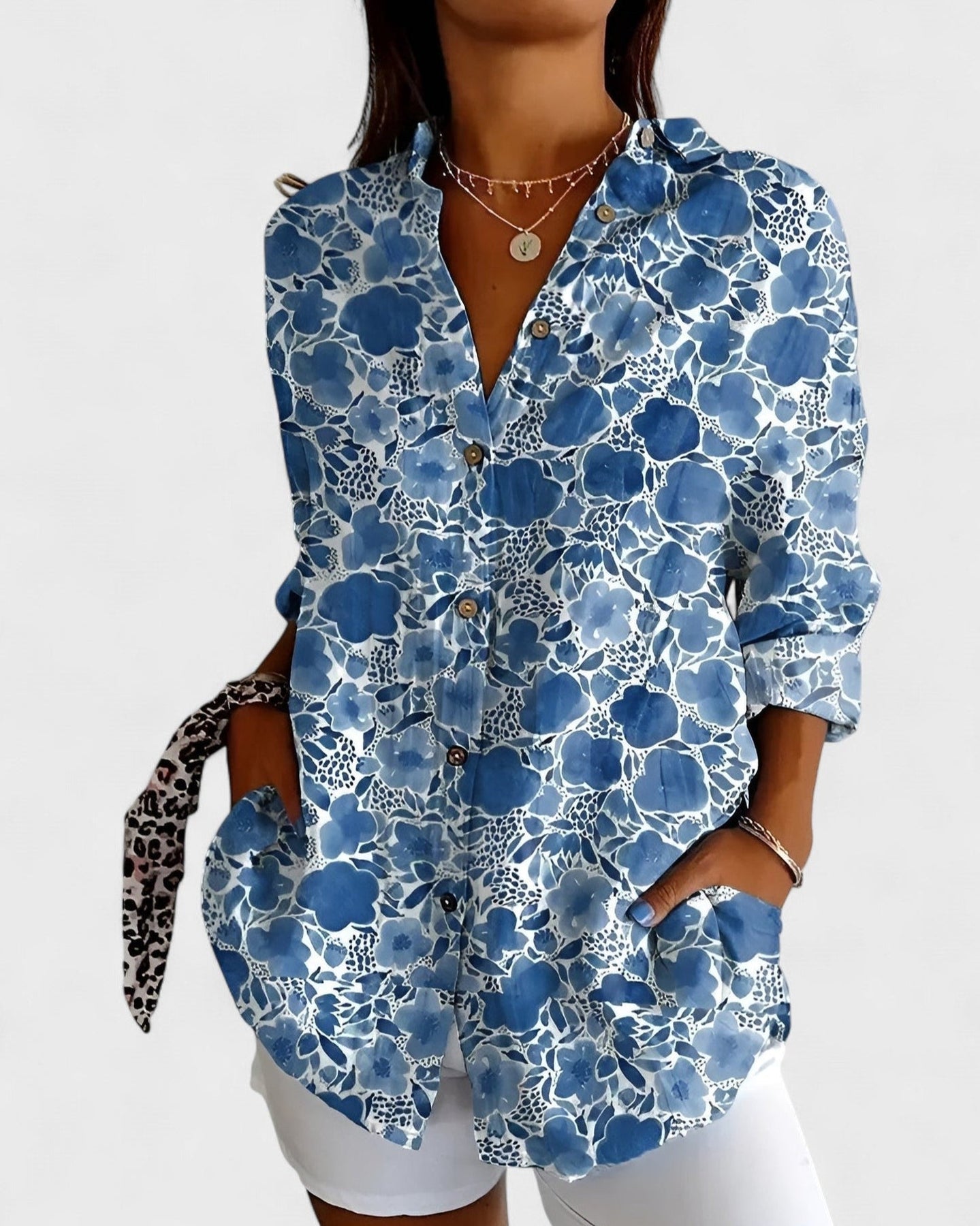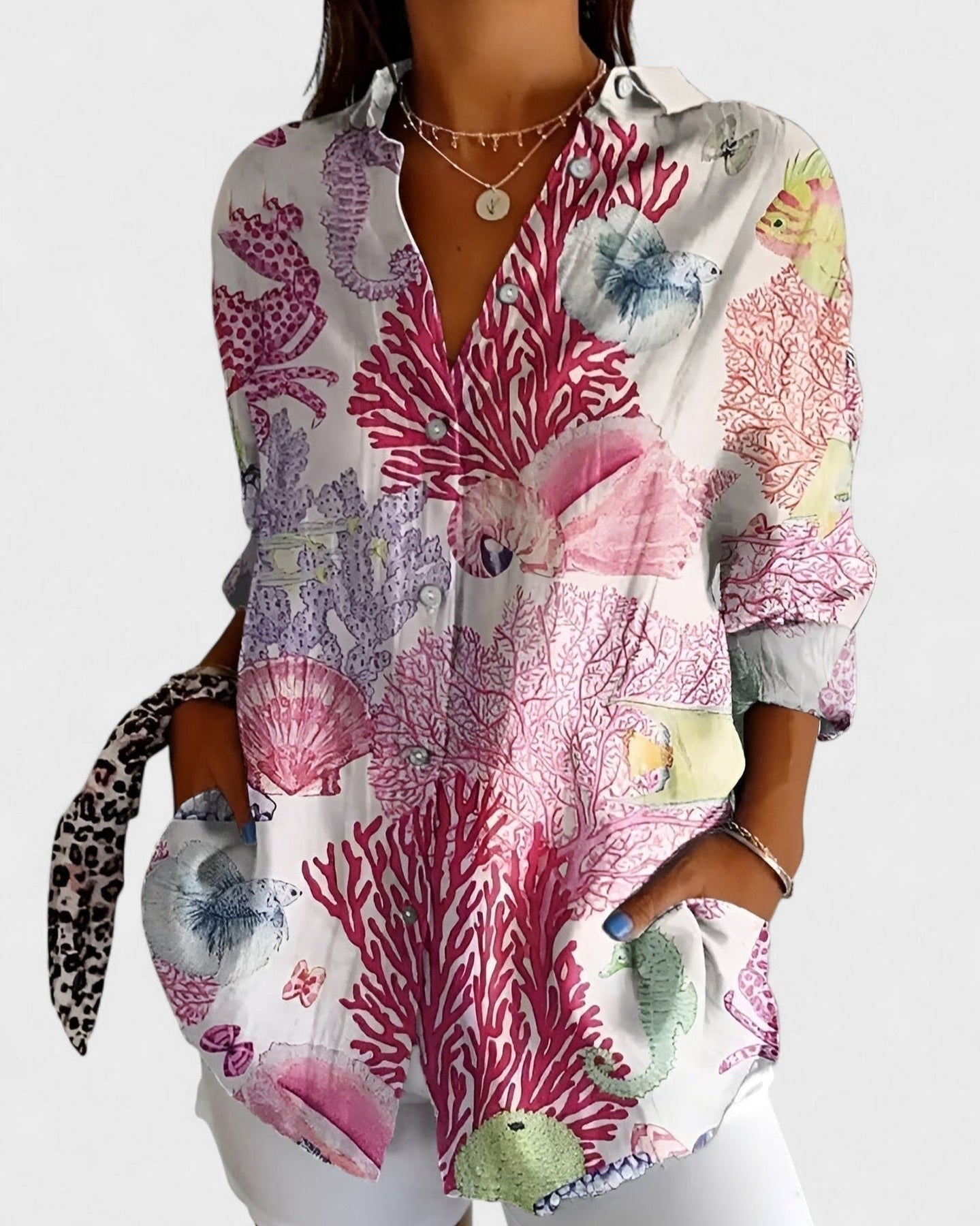 Тази риза с дълги ръкави и принт, вдъхновен от дълбочината на морето, е перфектната комбинация от лекота и смелост. Със своята свободна кройка, класически як и копчета, тя е идеален избор за небрежни, свежи аутфити, изпълнени с личност. Живописният дизайн придава енергия на твоя вид и те пренася веднага на слънчеви дни на морето.