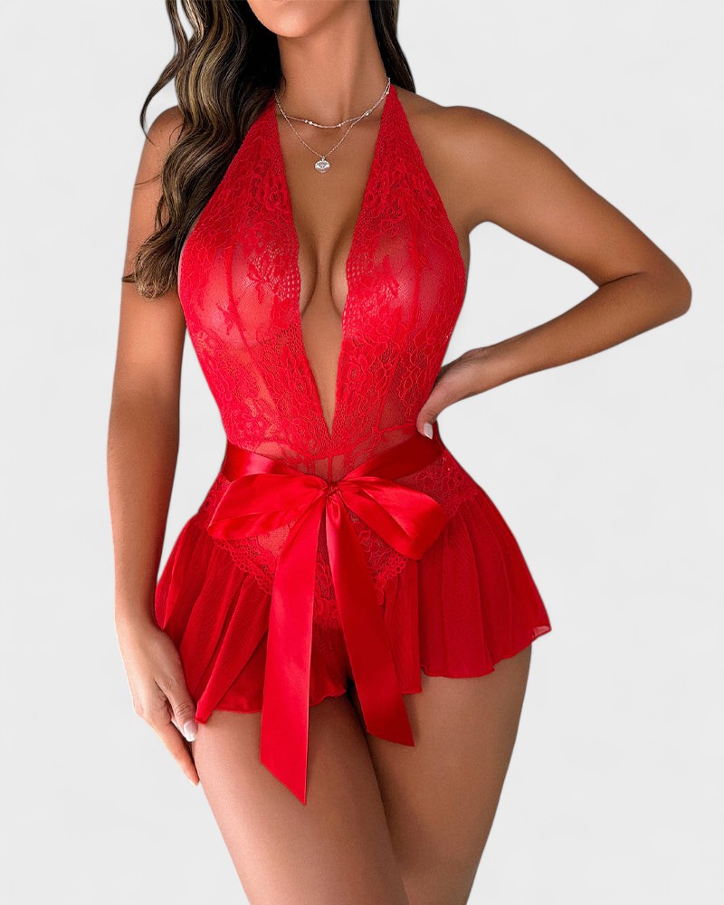 Секси дантелен боди с дълбоко деколте и сатенена панделка