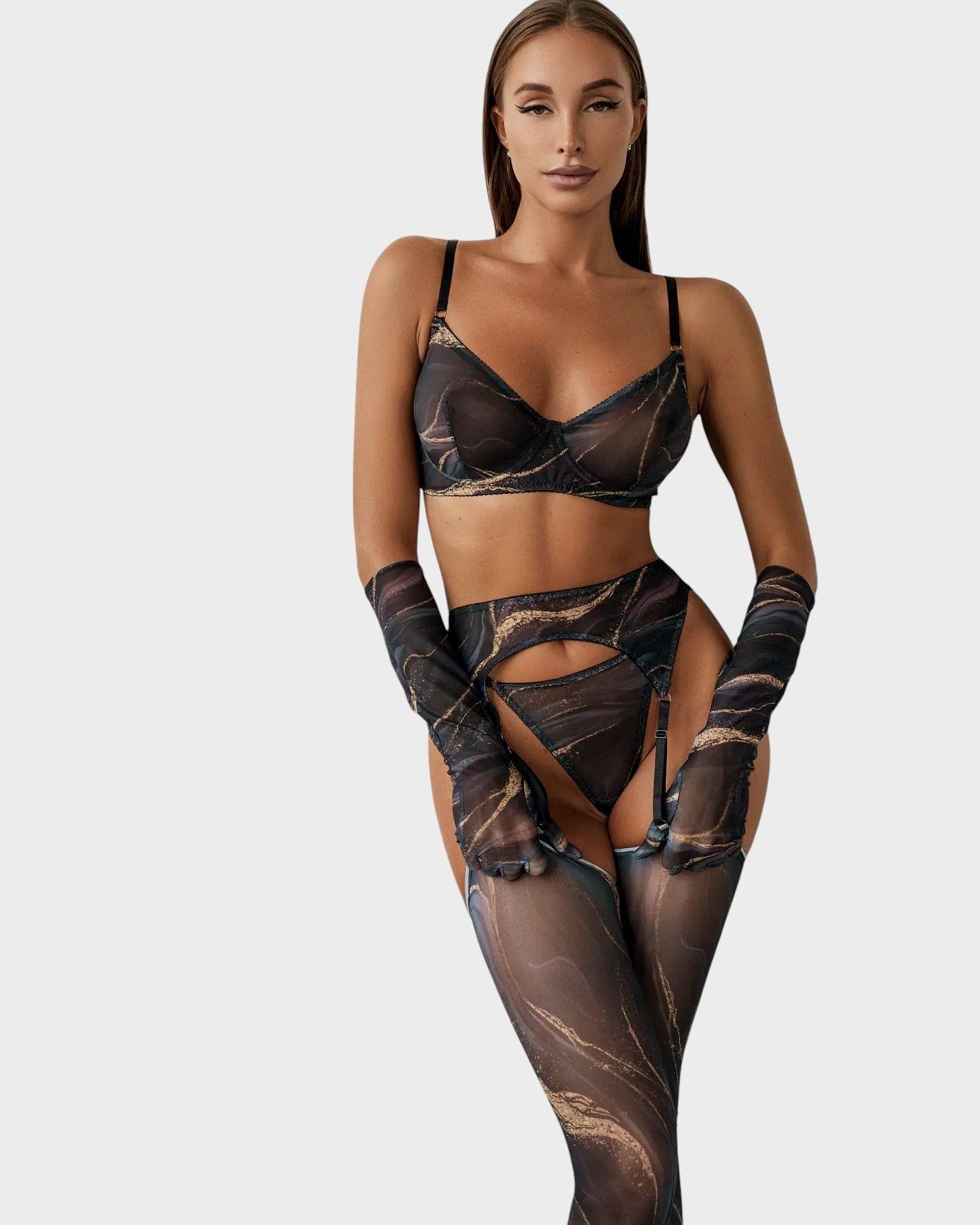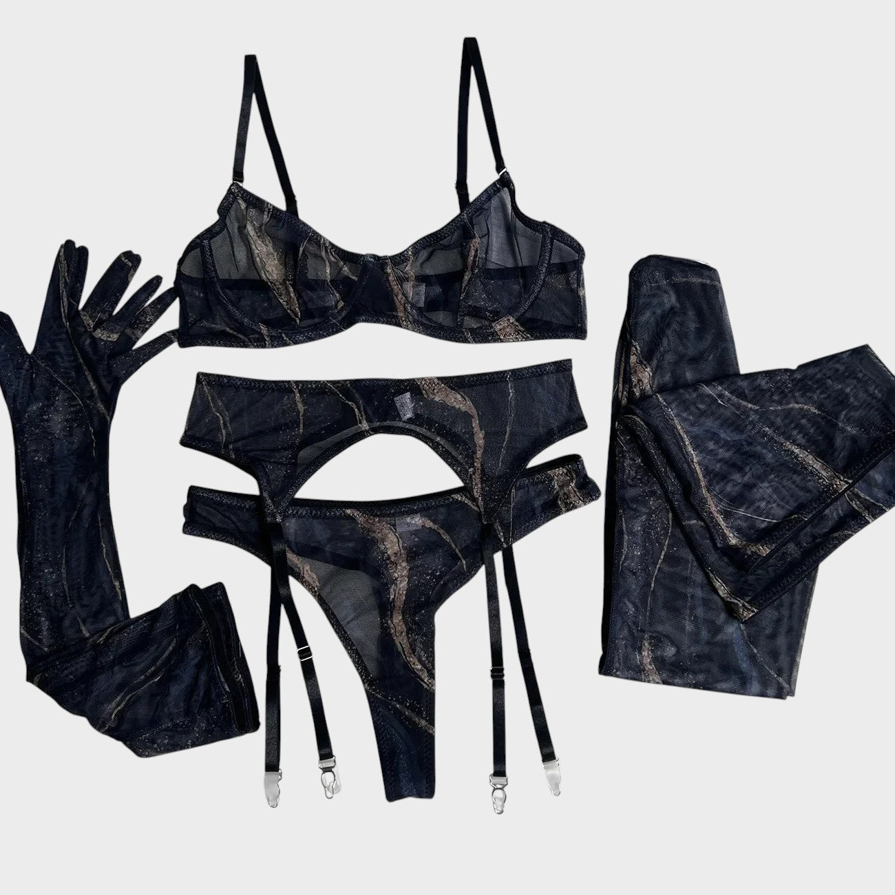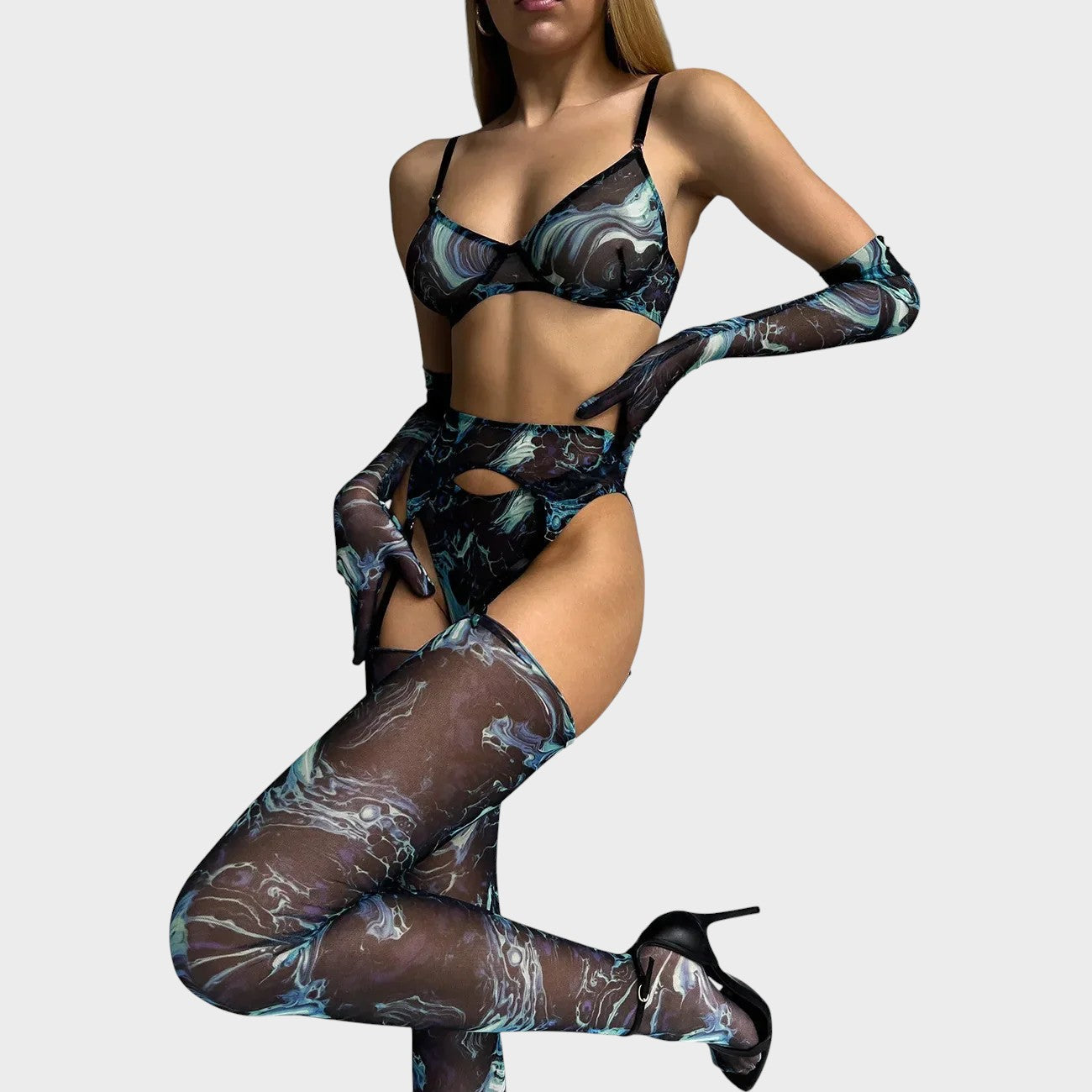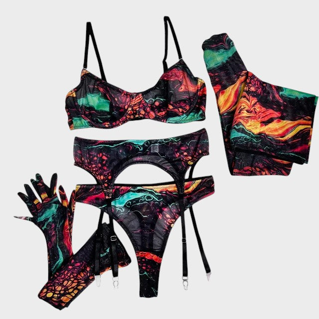 Изпитайте нова измерение на сексапилното бельо с нашия Серена | 5-частен комплект бельо с Tie-Dye, който перфектно съчетава елегантност и комфорт. Този ексклузивен комплект бельо не само, че е истински привлекателен, но също така ви дава несравнимо усещане за самочувствие и привлекателност.