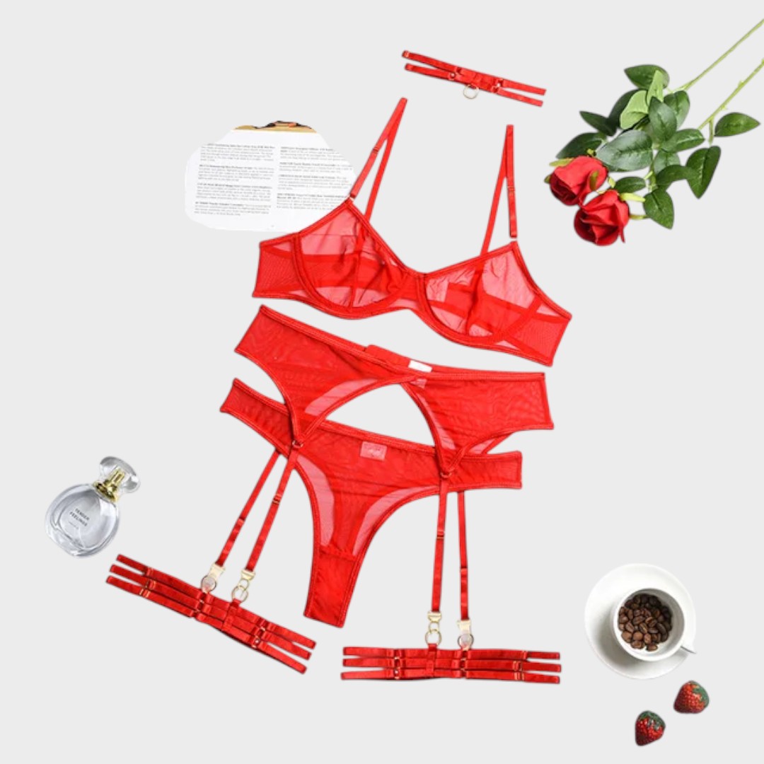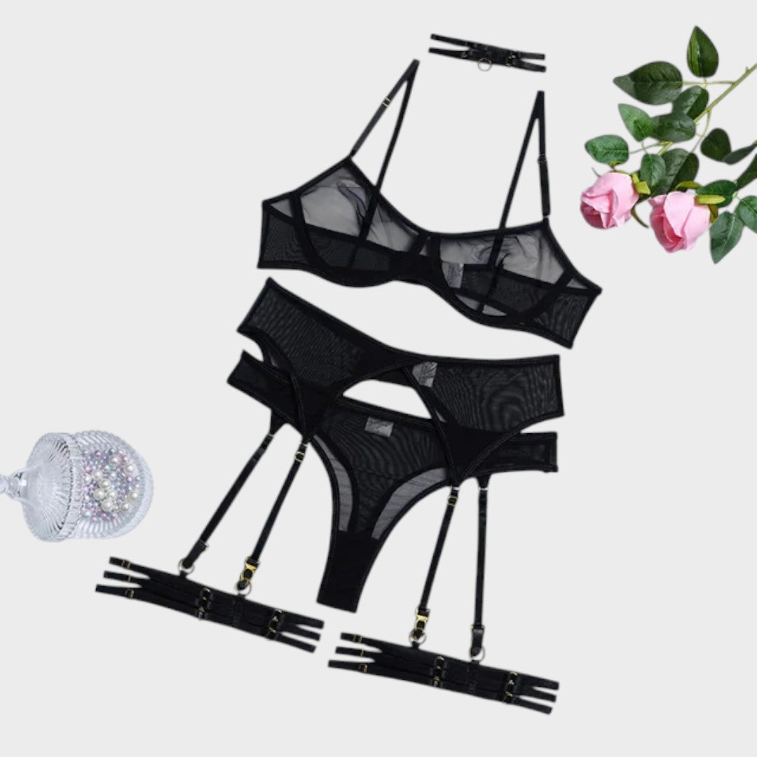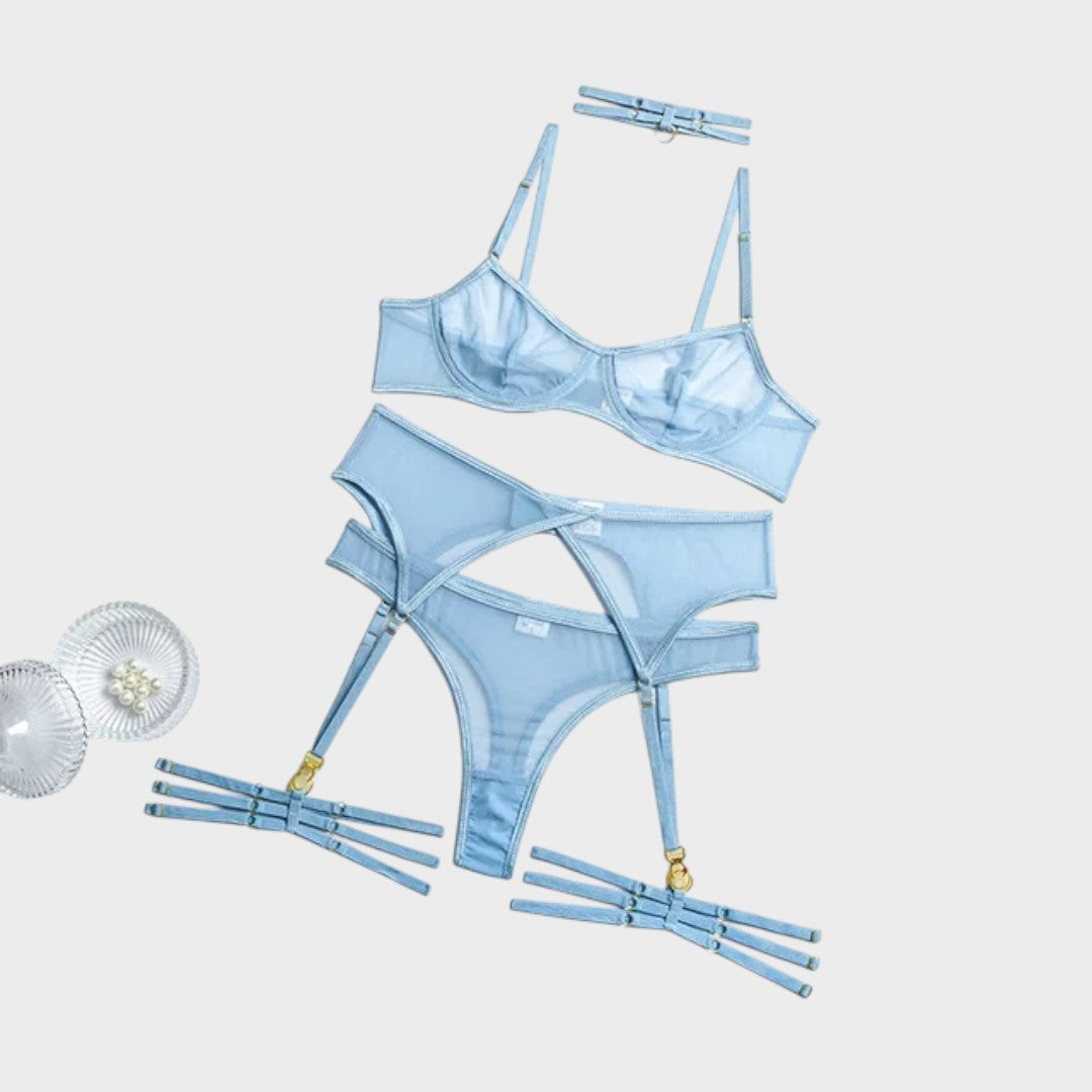 Открийте Скайлар | 4-частен комплект бельо, перфектната комбинация от сексапилно бельо, комфорт и стил. Този ексклузивен комплект бельо не само че седи перфектно, но и подчертава вашите естествени извивки. С елегантен и луксозен дизайн, дамското бельо е задължително за всяка модно осъзната жена, която иска да излъчва елегантност и самочувствие.