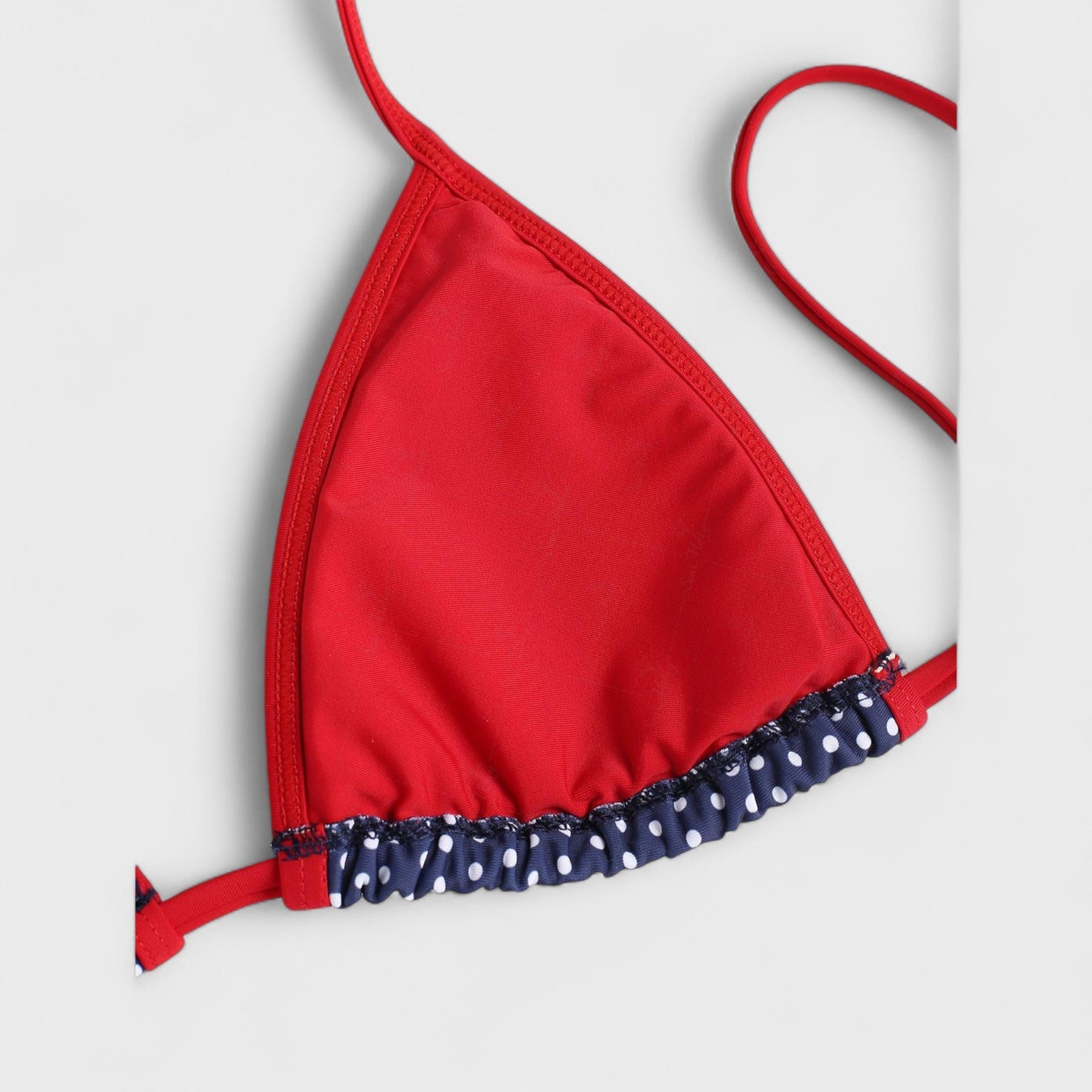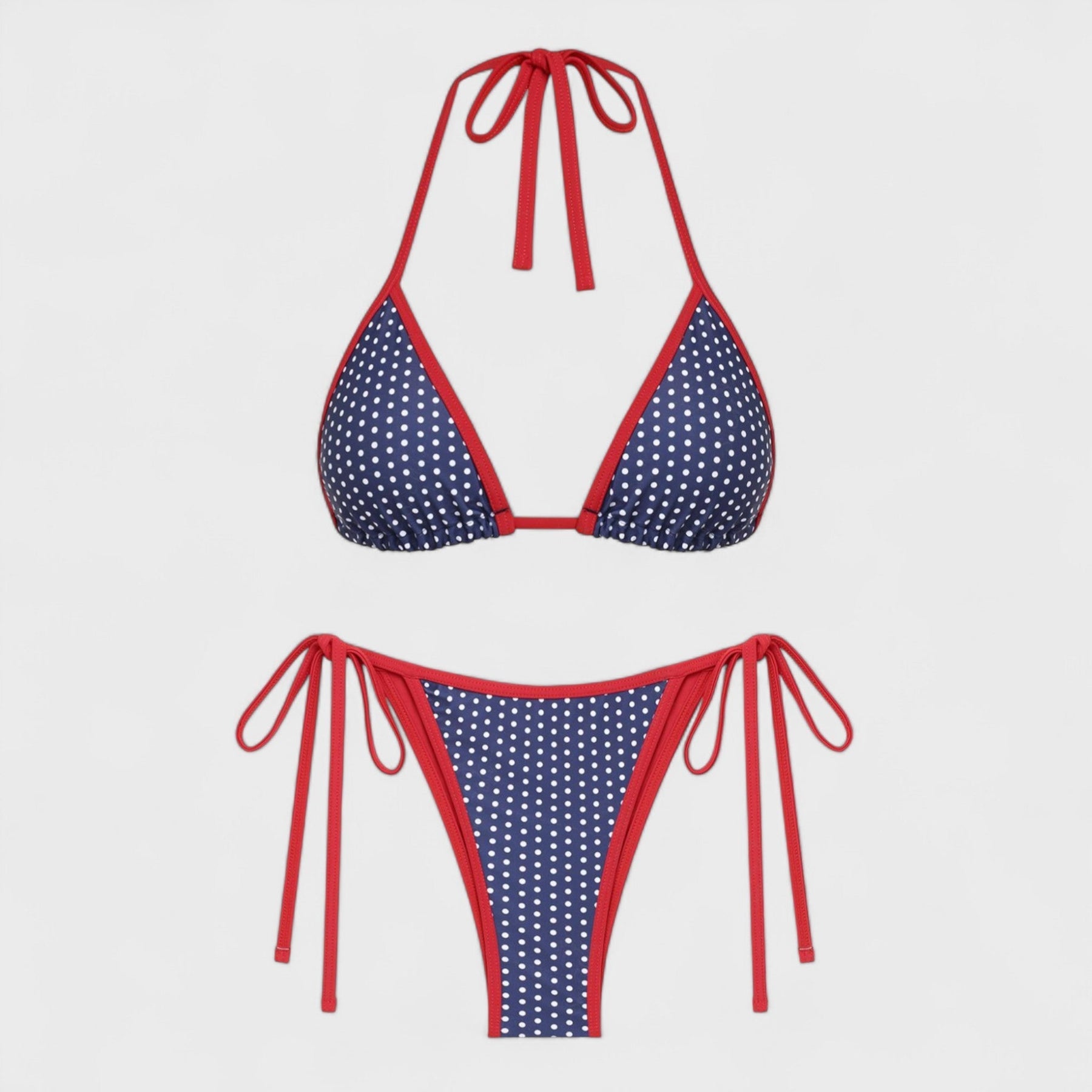 Този комплект бикини с триъгълна форма и фина шарка с контрастни ръбове е олицетворение на смел стил и женствено очарование. Връзките отстрани и на врата позволяват перфектно регулиране на всяка фигура, като същевременно осигуряват комфорт през целия ден на плажа или около басейна.