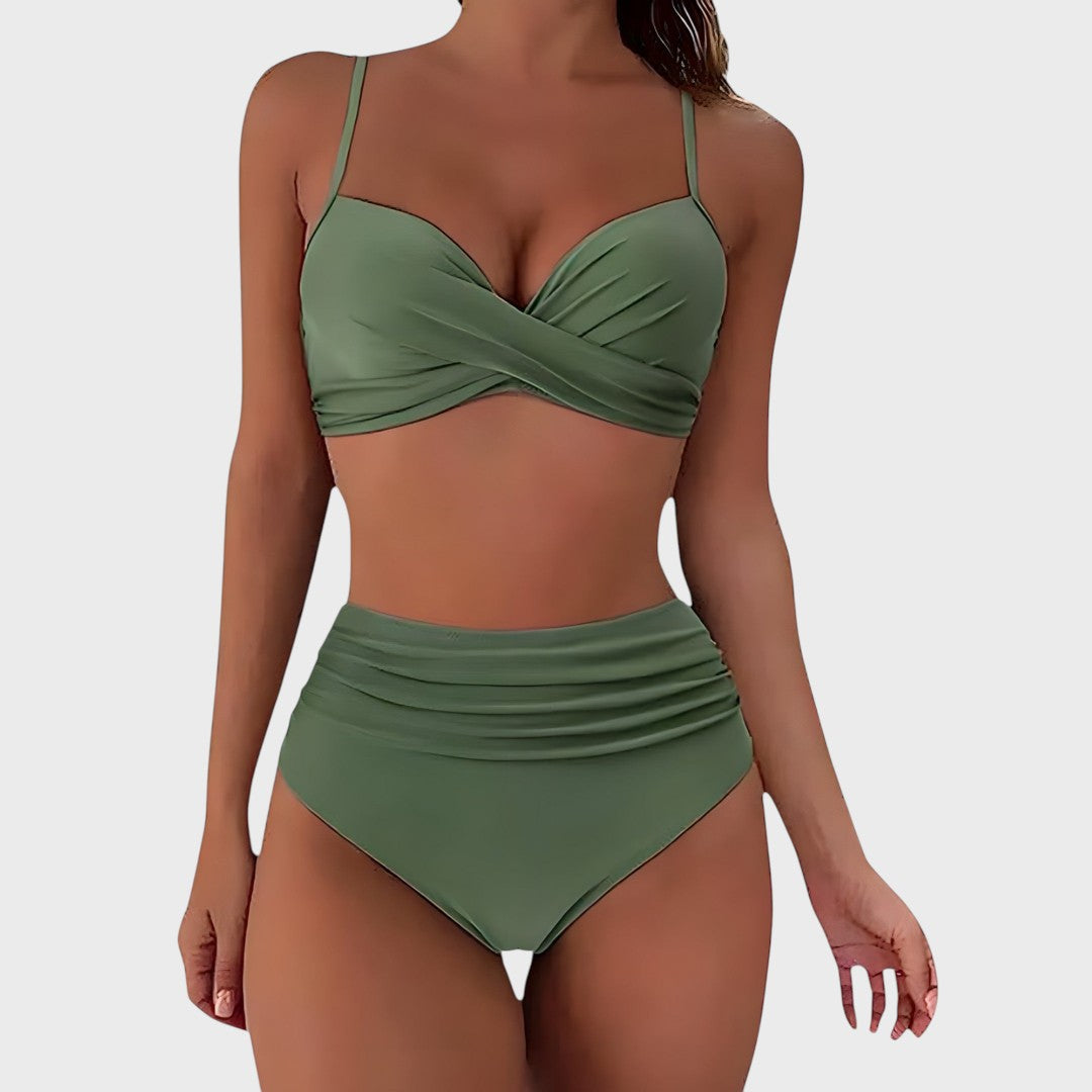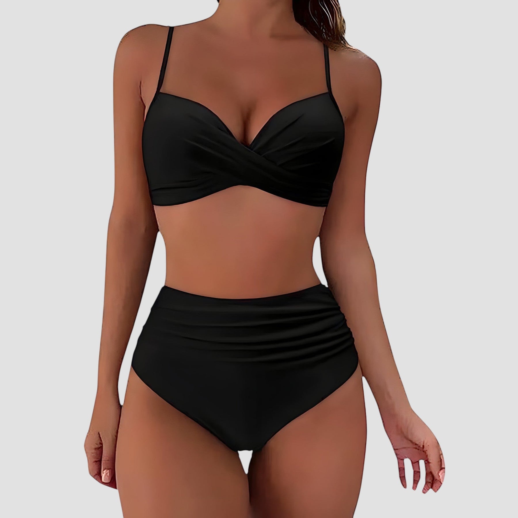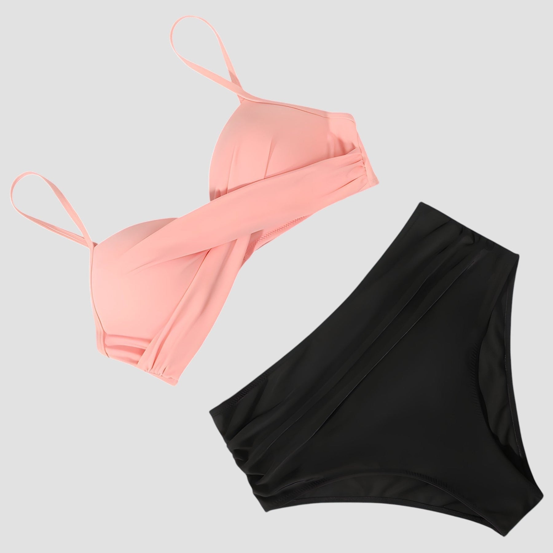 Този комплект за бански съчетава елегантност и комфорт в едно. Кръстосаният топ с регулируеми презрамки предлага отлична поддръжка и комфорт, докато високите бикини подчертават фигурата ти и ти дават увереност на плажа.