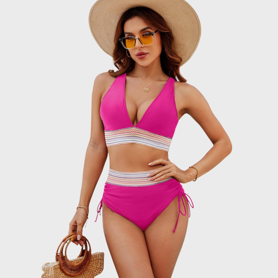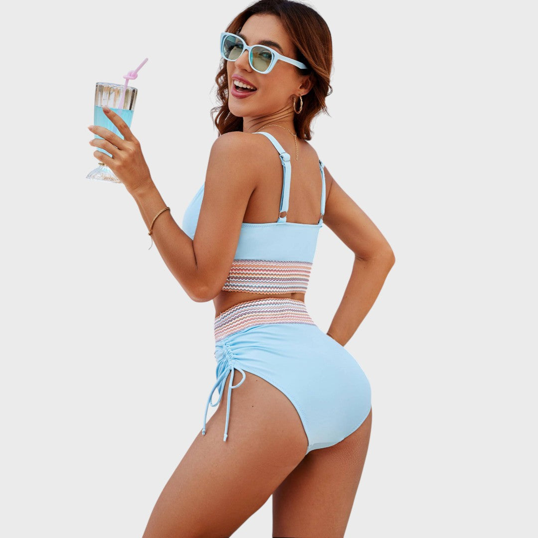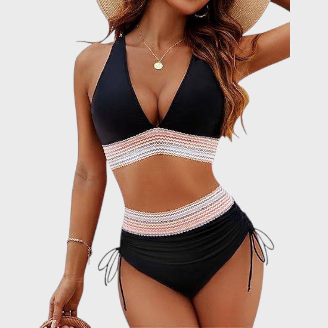 Подарете си самочувствието на лятото с този модерен комплект бикини с висока талия и удобен крой. Идеалният избор за плажа, басейна или ваканцията, където искате да се чувствате стилно и удобно. Обмисленият дизайн подчертава фигурата ви и осигурява перфектна опора през целия ден на водата.