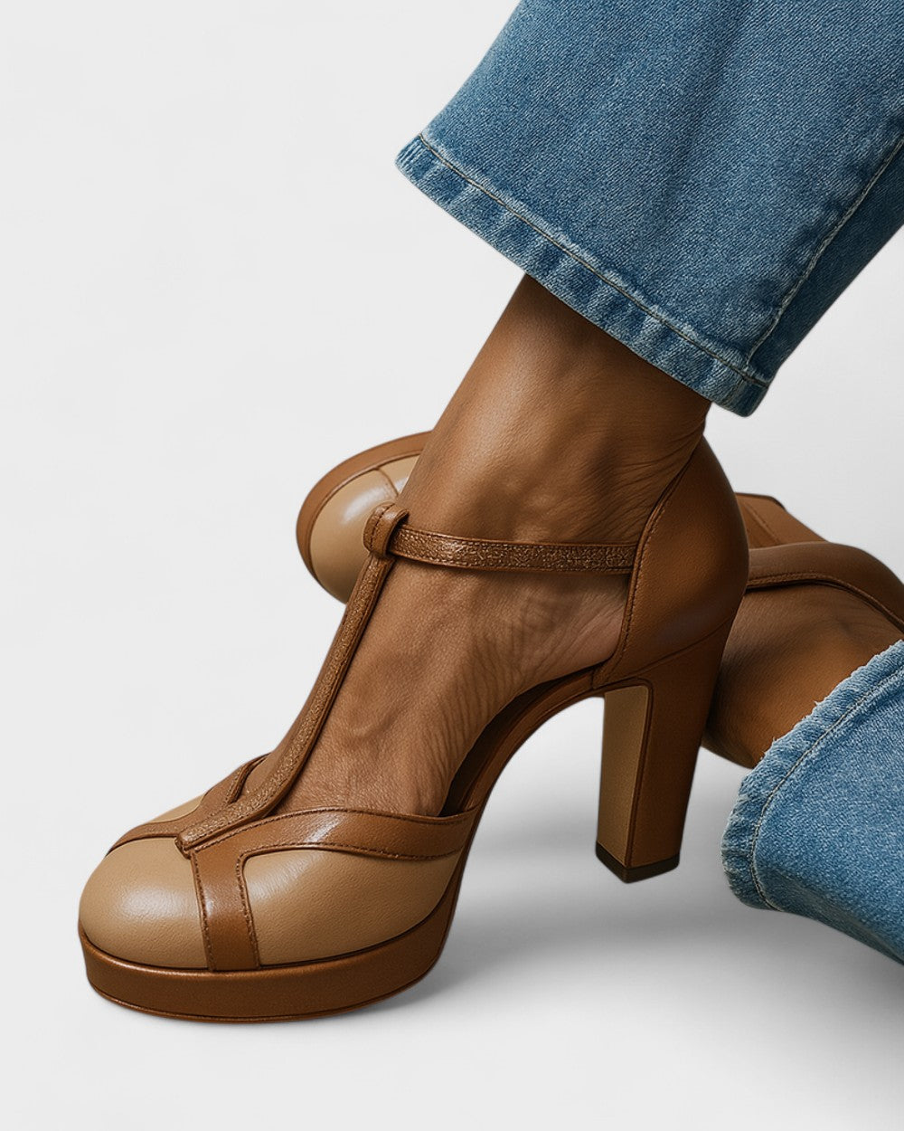 Дамски обувки с култови T-ремъци и стабилни блокови токчета. Закръглените върхове и дискретната платформа придават на краката по-дълъг вид и правят всяка стъпка по-лесна. Внимателно изработената горна част от висококачествена кожа, меката кожена стелка и регулируемият ремък плътно обгръщат стъпалото и осигуряват комфорт през целия ден. Вечната силуета е подходяща както за дънки, така и за рокли – от сутрешната среща до вечерното питие.